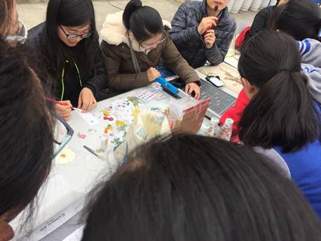 志愿者现场制作植物书签标本
