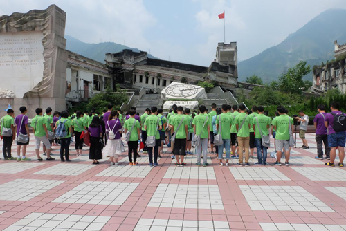 午后,营员们驱车前往映秀镇进行考察参观5·12地址遗址。在映秀镇漩口中学遗址前,营员们自发地站到一起为遇难者同胞默哀,深深感受到自然灾害给人们带来的苦难。“望着已经坍塌的教学楼,我的心被狠狠的刺痛。在大灾面前人类是渺小的,我们应当感恩生命、敬畏生命、珍惜生命。映秀的花儿又开了,灾后重建的房子也很美,伟大的抗震救灾精神深深震撼着我。作为一名中国人,我感受到了人间大爱,油然而生的是强烈的民族自豪感!” 来自山东省聊城市第一中学的陈鸿晔同学在她的笔记本上写下这样一段话。
