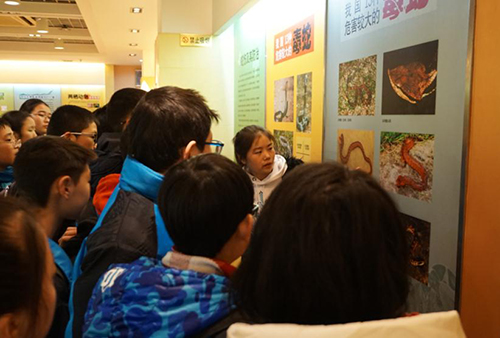 为了给学生们提供良好的科普讲解,科普馆一共派出讲解员30人次分层分组为学生们进行讲解,科普讲解主要围绕“两栖爬行动物的特点”,“两栖爬行动物和人类的关系”以及“认识和了解某些典型的两栖爬行动物”等内容展开。龚宇舟博士在做了“珍惜的大凉螈”精彩讲座。在讲解员讲解过程中,许多同学对于两栖爬行动物的相关知识表现出极大的兴趣,也不乏有提出诸如“如何更好的区分有无毒蛇?”、“活化石指的是哪种动物?”和“什么叫不完全双循环系统?”等有意义的科学问题的学生。面对问题,讲解员也都给予科学的解释。