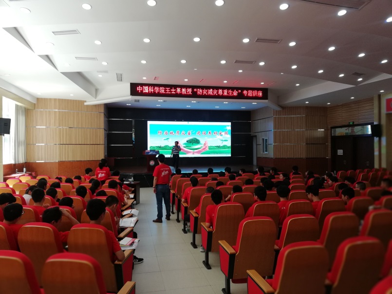 在两个半小时的讲座中,王士革研究员充分发挥数十年科研工作所思所见的积淀优势,采用幻灯片讲解、播放影像、展示图片、领读、提问等方式,就自然灾害的防御、遭遇自然灾害如何自救等话题为学生们呈现了一堂精彩生动的讲座。讲座期间,师生互动不断,会场气氛非常活跃。