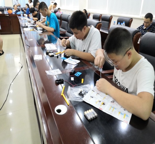 在“神奇的激光”科学探究环节,营员们体验了密室内的激光阵,并动手制作激光报警装置。活动最后,老师们为营员颁发了光电所科普协会评选的“科学之星”证书。