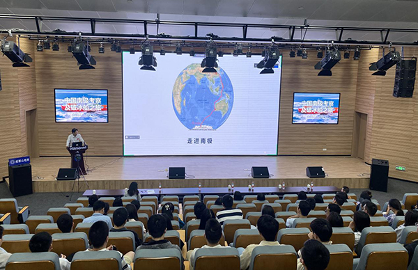 沈权在报告中介绍了南极建站的历史,分享了自己在极地驾驶“雪龙号”航海和科考中的见闻与故事,图文并茂地展示了极地科学家们考察的艰难历程、展现“雪龙号”的风采和极地风光,向广大师生传达了爱国、求实、创新、拼搏的南极考察精神。