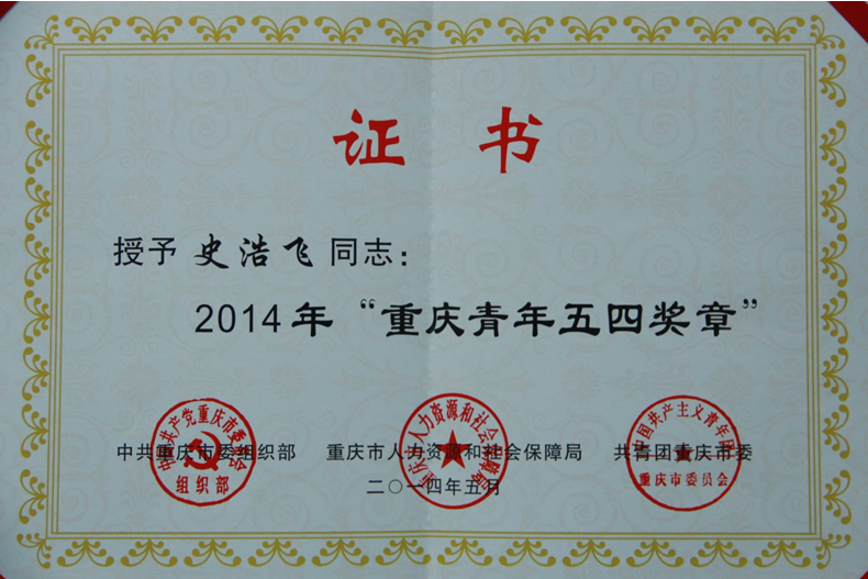 重庆研究院史浩飞研究员荣获2014年“重庆青年五四奖章”