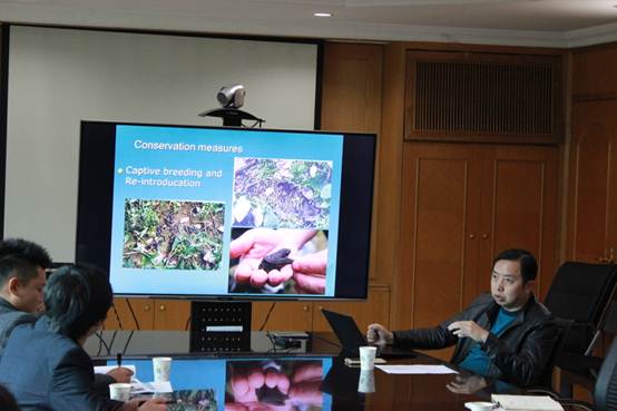 两栖爬行动物研究室谢锋研究员展示镇海棘螈保护实践工作成果
