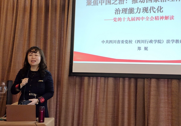 会议邀请四川省委党校郑妮教授围绕党的十九届四中全会精神作题为“聚焦中国之治:推动国家治理体系和治理能力现代化”的专题讲座。郑妮详细阐述了十九届四中全会的基本情况和重大意义,全面阐释了中国特色社会主义制度和国家治理体系的显著优势,系统解读了全会《决定》提出的总体要求、总体目标和重点任务。