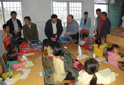 在龙形山村小学,赵永涛仔细询问了分院为孩子们新购置的课桌椅和环保黑板的使用情况。他走进教室和孩子们亲切交谈,并代表院属成都地区各单位为孩子们送上了崭新的书包和文具。