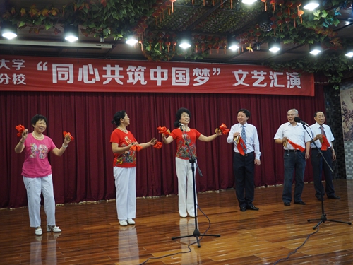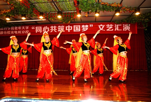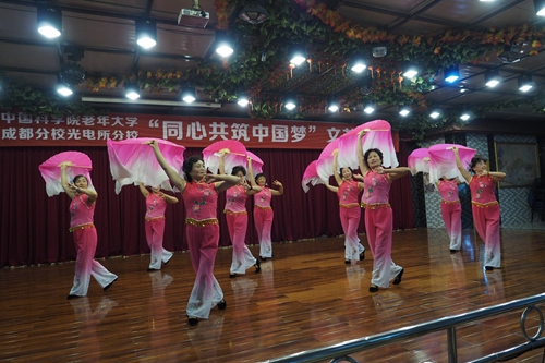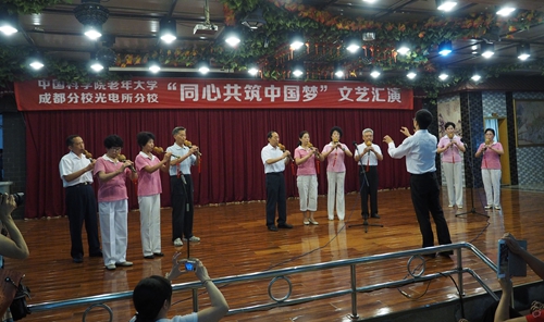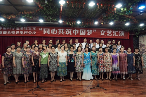 “六月骄阳红似火,满天星里人潮涌;两校师生齐相聚,共度欢乐好时光”。6月20日,伴随主持人高亢的朗诵声,中科院老年大学成都分校、光电所分校“同心共筑中国梦”文艺汇演拉开帷幕。这是自两校成立7年以来的首次汇演,成都分校校委会的部份成员、两校的领导和学员们一同观看了师生们的精彩演出。