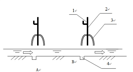 A为闸门1,B为闸门2;(1)为轻质污染物收集槽,(2)为闸体,(3)为导流管,(4)为重质污染物收集槽;