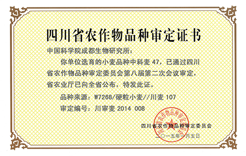 经四川省农作物品种审定委员会研究,中国科学院成都生物研究所王涛研究员课题组选育的小麦新品系W47已通过四川省农作物品种审定,并正式定名为“中科麦47”(编号为川审麦2014008)。