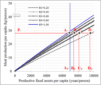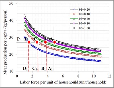 该研究从牧区农村家庭这一独特视角出发,以家庭人均牛羊肉产量这一核心生计资本为对象,重点开展牛羊肉产量和高寒草地生产季节降水集中指数(PCI)之间的关系研究,并按照PCI不同情景对农村家庭生产性资产、劳动力适应的效果进行定量预估。经研究揭示:1)农村家庭人均肉产量对生产性固定资产、劳动力、PCI具有敏感性。当农村家庭人均生产性固定资产投入、PCI每增加1个单位,人均牛羊肉产量将分别增加0.938、0.218个单位,而单位家庭劳动力投入每增加1个单位,将导致农村家庭人均肉产量降低0.268个单位;2)PCI下降导致的肉产量损失可通过人均生产性固定资产投入的成倍增量以及牧业劳动力投入的减量来弥补。