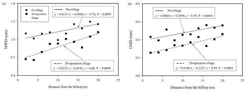 强烈耕作后平均质量直径(MWD)、平均几何直径(GMD)在不同坡位的变化:(a)MWD;(b)GMD