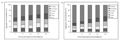 不同坡位各级水稳性团聚体的分布:(a)耕作前;(b)20次耕作