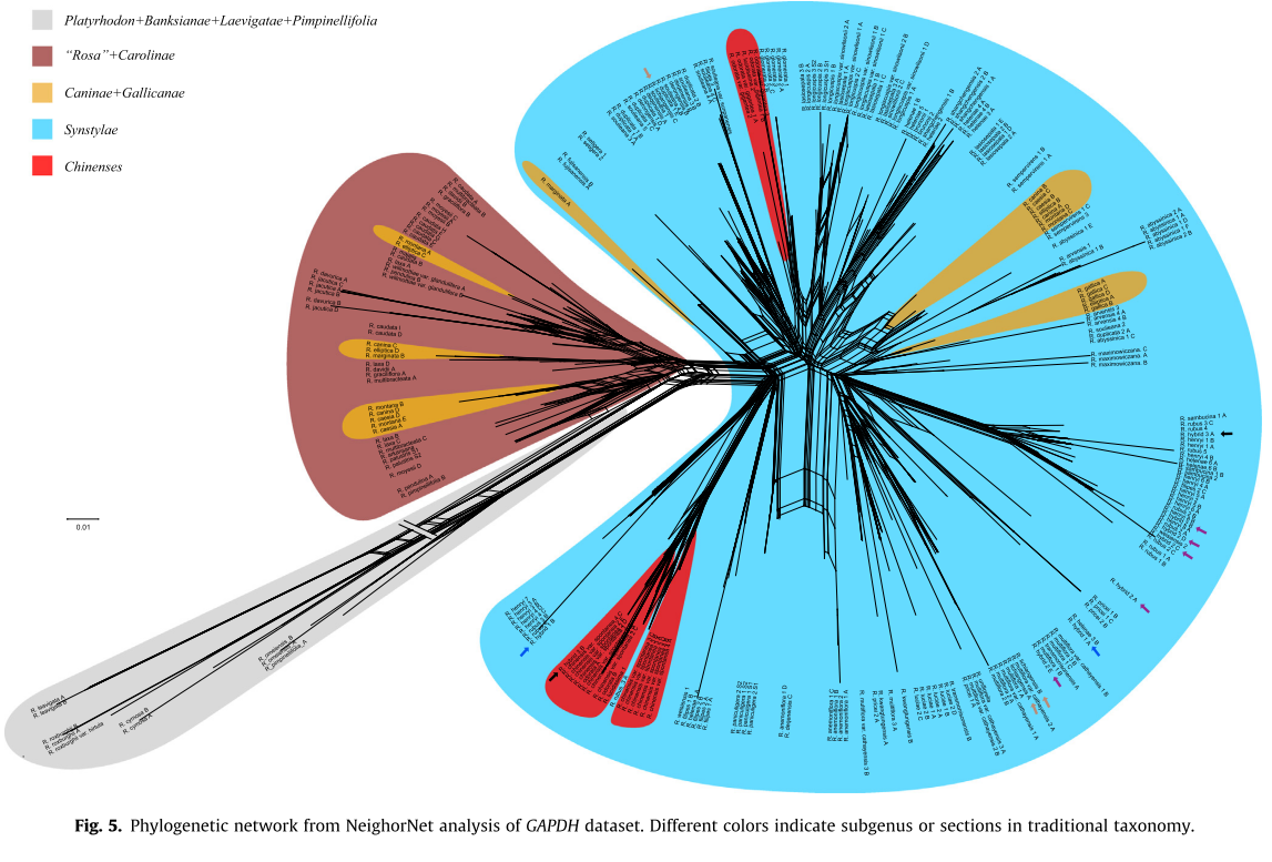 重建后的蔷薇属分子系统显示该属合柱组和月季组成一个单系,在此基础上,朱章明博士利用四个叶绿体DNA基因(ndhC-trnV, ndhF-rpl32, ndhJ-trnF and psbJ-petA)和两个核基因(ITS和GAPDH)对这个单系中包含的全部物种126个个体进行了序列测定,并对ITS和GAPDH进行了克隆,以探讨该单系类群的种间进化历史。结果显示该类群叶绿体基因与核基因的系统树不一致,其原因可能是该类群物种早期的杂交起源,并发现了狭域分布物种的杂交起源以及自然界客观存在的一些种间杂交个体。