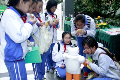 在开幕式现场,与会代表参观了成都分院组织的科技实物展。光电所的激光键盘、成都生物所的两栖爬行动物标本、成都信息技术公司的基层会议选举系统以及深圳先进院未来天使机器人和教育机器人等科普产品,深受广大师生的喜爱。武侯电视台还对教育机器人、激光键盘和两栖爬行动物标本等参展项目进行了现场专访。
