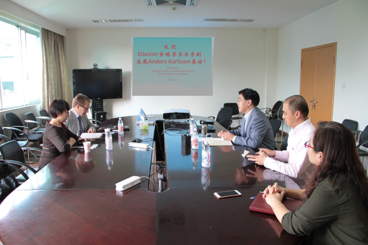 5月13日,爱思唯尔公司(Elsevier)全球学术关系副总裁Anders Karlsson及爱思唯尔学术关系资深经理康晓伶等一行到访中国科学院成都文献情报中心,成都文献情报中心主任张志强及副主任邓勇、杨志萍等接待了Anders Karlsson一行,并举行了小范围座谈交流。
