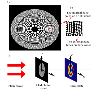 为了寻找一种简单有效,灵活可控且能够产生极小中心暗斑的局域空心光束产生方法,光电所项目组提出了一种利用光子筛产生空心光束的方法。该光子筛结构是一种圆周对称结构,分为内环和外环,两者在焦点处光场相互抵消,在其他区域由于失去了这种对称性,所以两个区域光场不会相互抵消,总体来说形成局域空心光束。光子筛作为一种新型的衍射元件,具有很强的聚焦能力。该项目组提出的光子筛结构,产生的空心光束具有微米甚至亚微米尺度的中心暗斑,而且结构简单实用,易于阵列化。