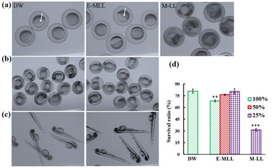 渗滤液 (M-LL),EDTA-Na2Zn处理后的渗滤液(E-MLL)及DI water (DW)处理后的斑马鱼发育形貌及存活率。