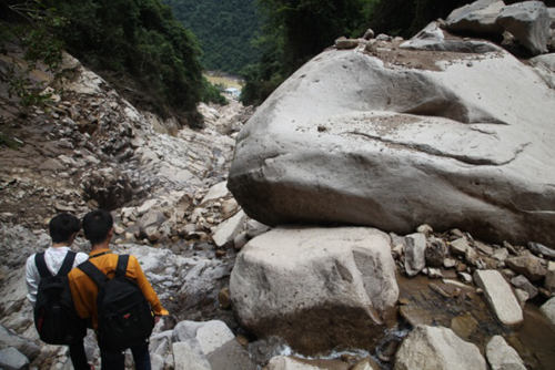 泥石流搬运巨大颗粒堆积于扇区