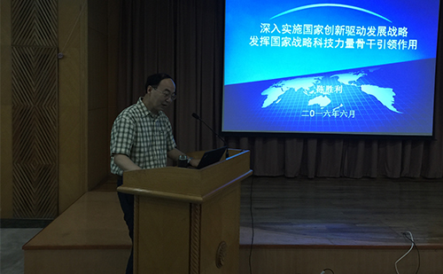 陈胜利作了题为“深入实施国家创新驱动发展战略发挥国家战略科技力量骨干引领作用”的专题报告。报告从深刻理解国家创新驱动发展战略意义、实施国家创新驱动发展战略发挥先发优势引领发展、发挥国家战略科技力量骨干引领作用等三个方面进行了阐述。报告分析了我国科技创新的优势和不足,指出创新驱动发展是我国发展的需要,是国际竞争的大势所趋,是民族复兴的国运所系,是我国科技创新的必然选择,实施创新驱动发展战略是我国发展全局的重大抉择。报告结合我国“十三五”规划和创新驱动发展战略纲要,阐释了科技创新支撑国家发展战略引领经济发展、提升原始创新能力强化创新源头的新举措,打造区域创新高地引领创新水平整体跃升的新布局。报告指出,中国科学院提出的“三个面向,四个率先”着眼于世界科技强国战略,是立足创新驱动发展现实的需要。中国科学院将在优化布局重点力量、立足重要基础科学交叉前沿、加强国防科技创新、加强战略性新兴产业研发、组织实施“一三五”规划和战略先导科技专项、建设国家创新人才高地等六个方面加快实施创新驱动发展战略,充分发挥科技创新引领作用,坚持“三个面向、四个率先”,为实现中国梦做出新贡献。