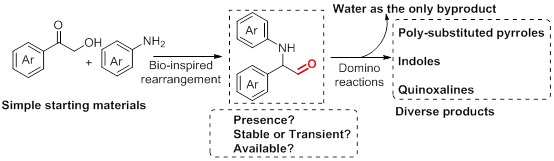 葡糖胺-6-磷酸合成酶能将生物体内的糖通过一系列的串联反应变成相应的N-乙酰葡糖胺(GlcNAc),该产物是细菌和真菌细胞壁构建的基本模块。从中受到关键性的启发:α-氨基醛可以通过α-羟基酮得到。但是,要模拟该过程有以下难点:1)α-氨基醛不稳定,特别是对于氮上没有保护基团的α-氨基醛;2)酶催化过程中,是靠分子内的羟基捕捉原位产生的醛,而我们需要通过普通的α-羟基酮与芳香胺原位产生醛,并且还要通过分子间的亲核进攻捕捉产生的醛具有较大的挑战。通过该策略,研究人员设计了一些列的串联反应,成功实现了不同类型的含氮杂环,包括不同取代类型的多取代吡喏,2-芳基吲哚,喹喔啉等的合成。值得一提的是该策略仅通过一个相似中间体实现了多种不同类型的含氮杂环的合成,反应过程简单、快速、高效率、无过度金属参与,且所有副产物均为水。该研究成果最近发表在以下期刊:Org. Lett(2016, 18, 4526)。
