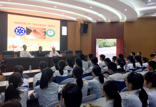 讲座前,席南华代表国科大向宣汉中学授予“优秀生源基地”牌匾。自2014年国科大招收首届本科生以来,宣汉中学已经有8名毕业生考入国科大。席南华说,很难得在这样贫困的地方有这么漂亮的学校,宣汉中学的同学们朴素大方,眼睛里闪动着灵气,希望更多宣汉中学的优秀毕业生报考国科大。中科院成都教育基地办公室负责人向宣汉中学校领导转交了国科大给宣汉中学100周年校庆的贺信。