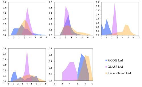 MODIS LAI、GLASS LAI与地面站点实测LAI频率直方图对比