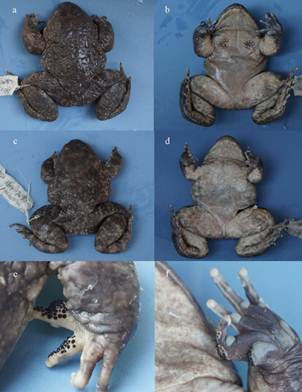 重新指定的双团棘蛙属模式种G. yunnanensis新模及新配模(新模背面(a) &腹面(b) ; 新配模背面(c) &腹面(d) ; 新模手指婚刺(e) ;雌性新副模手部的婚刺(f))