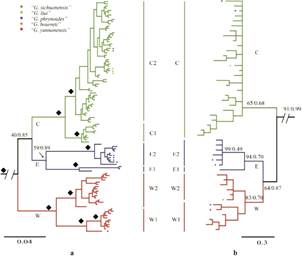 双团棘蛙属系统进化关系(整合ND2(a) 和12S, 16S rRNA联合序列(b)构建的贝叶斯树)