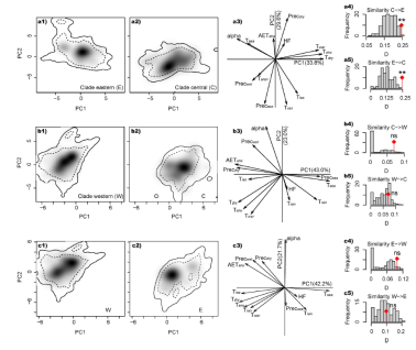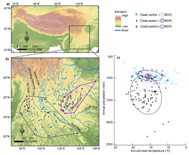 在前期基础上,进化与保育研究团组胡军华研究员等整合地理空间(G-space)的分布模拟和环境空间(E-space)的生态位保守性检验解答了支系隔离后生态位的分化程度对物种形成过程的影响等科学问题。研究发现各支系对间并无显著的生态位分化,而在环境空间显示出生态位保守性特征。该研究阐明如何检验支系分化中的生态位保守性能为深入理解物种形成过程提供帮助,并有助于后续的保护生物学研究。研究成果以Niche conservatism in Gynandropaa frogs on the southeastern Qinghai-Tibetan为题发表于Scientific Reports (原文链接)。