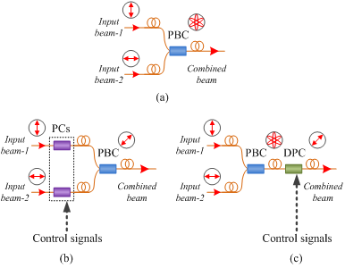 相干偏振合成原理图(a)开环(b)相位控制闭环(c)偏振控制闭环