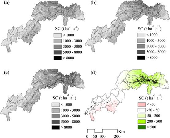 土壤保持生态服务功能的时空变化(a,2000年;b,2005年;c,2010年;d,变化趋势)