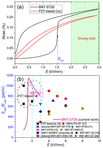 现在使用的压电驱动器都是基于PZT压电陶瓷,但PZT陶瓷在生产和废弃过程中会对环境产生潜在的影响。BNT陶瓷由于环境友好性、大变形量、高刚度和耐电学疲劳特性等因素成为研究者青睐的下一代压电驱动器原材料。然而,BNT陶瓷存在驱动电场过高和共烧温度过高等问题。在最近的研究过程中,通过材料组分、相结构和晶粒尺寸的控制,得到了低驱动电场下应变量较大的BNT陶瓷。基于该陶瓷,通过流延叠层共烧的工艺进一步开发出BNT陶瓷压电驱动器原型。相比于目前已经报道的性能最优的BNT压电驱动器而言,驱动电场/电压进一步降低了三分之一,朝着实用化方向迈出了重要一步,更加接近于PZT驱动器的应用参数。同时,由于采用低温烧结技术,内电极贵金属含量降低,器件的制造成本更低。本研究结果已申请专利一项,在专业期刊上发表论文两篇。