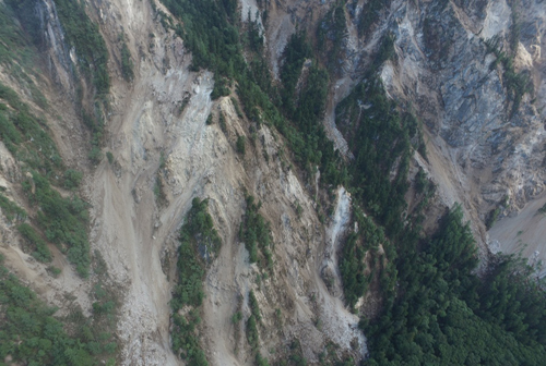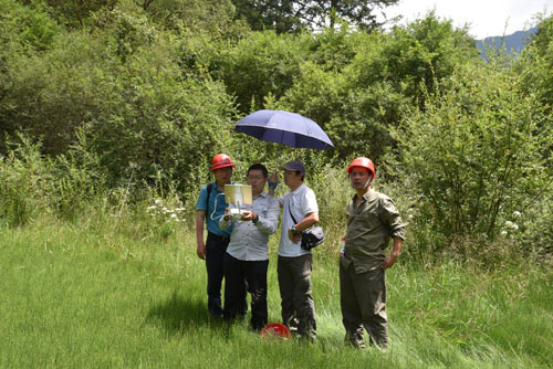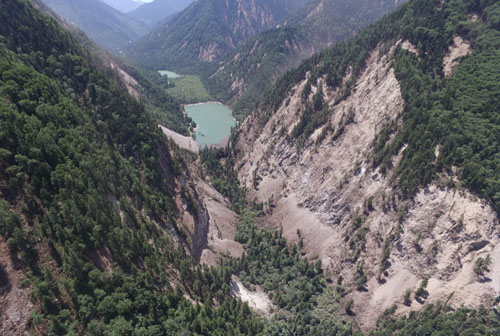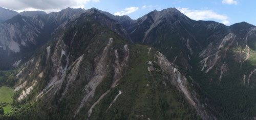 8.8地震后,震中丹祖沟崩滑灾害密集发育,通行条件极差,且余震作用下崩塌、滚石不断。专家组在成都山地所副所长陈晓清、总工程师游勇的带领下,冒险进入丹祖沟上游开展灾害调查与无人机航拍工作。专家组花费4个多小时艰难挺进至震中地区,克服高海拔、高风压、峡谷区、密林小窗口的极端复杂条件,顺利完成多架次无人机航拍任务,取得了震中区宝贵的地震次生灾害与生态环境破坏数据,初步查明震中灾害发育情况和沟道堵塞情况,对预测丹祖沟泥石流活动趋势提供了可靠的支撑。同时,专家组还完成了五花海断层两侧地震次生灾害的调查和航拍工作。