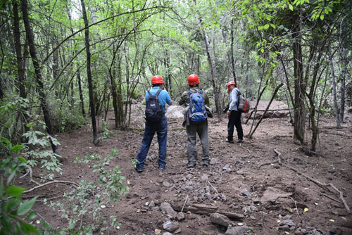 考察荷叶寨后山崩滑体后缘变形拉裂情况