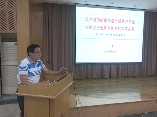 叶彦还以“以严明的纪律推进全面从严治党,为研究所改革创新发展保驾护航”为题作了专题报告。报告引经据典阐明了“纪律是强制性的,纪律就是约束”的意义。他引用《党章》、《中国共产党廉洁自律准则》以及习近平总书记的重要讲话,充分论述了“纪律建设是全面从严治党的根基”;结合我所实际,强调了要以严明的纪律做好我们的各项工作。他指出了我所在纪律方面存在的问题和表现,要求所党委及其成员、各党支部及其委员务必牢记全面从严治党责任,把纪律立起来,把纪律严起来,执行起来;要坚守纪律,转变工作作风,以严明的纪律做好我们的各项工作,做好廉洁从业工作;要认真学习贯彻中科院党组夏季扩大会议精神和部署,真抓实干,促进“三重大”成果产出,以优异的成绩迎接党的19大胜利召开。