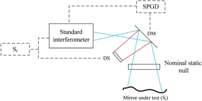 由于自由曲面的表面面形自由度更大,梯度更大,往往超出了传统干涉测量的动态范围,使得很难实现面形的高精度检测,这给光学自由曲面的制造带来很大困难,严重限制了光学自由曲面的发展与应用。光电所与清华大学组成的联合研究团队提出了一种全新的自由曲面检测技术,采用大行程变形镜作为面形补偿元件,使用条纹反射测量技术实现高精度变形镜的实时动态监测与闭环控制,建立复杂自由曲面的面形自适应搜索模型,研究高精度的系统误差标定技术,使得自由曲面能够实时快速检测,基本原理如图1所示。