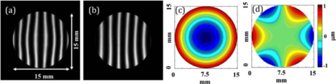 图2为检测实验现场图,图3为变形镜产生第四项和第九项zernike面形时,DS得到的变形条纹图和对变形镜面形变化的检测结果。实验中被测件为一带有像散的未知曲面,如图4(a),其面形误差超过了干涉仪的测量动态范围,因此干涉仪无法获得条纹而无法完成测量。基于该研究提出的测试装置及SPGD自适应搜索模型,在200秒左右就可获得待测自由曲面的清晰条纹,如图4(d)所示。这样根据检测硬件建立系统检测模型,结合干涉检测结果和条纹反射测量结果,通过面形匹配与系统误差标定技术,得到被测面的面形误差,检测结果如图5所示。
