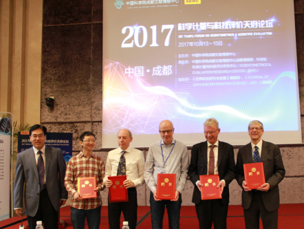 论坛开幕式上,张志强向聘请的5位国内外知名教授颁发了客座研究员聘书,他们是,Scientometrics期刊主编、比利时鲁汶大学沃尔夫冈·格兰泽(Wolfgang Glänzel)教授,原国际科学计量学与信息计量学学会(ISSI)主席罗纳德·鲁索(Ronald Rousseau)教授,北欧创新、研究与教育研究所(NIFU)奎纳尔·西韦特森(Gunnar Sivertsen)教授,瑞典皇家理工学院派尔·爱尔格伦(Per Ahlgren)副教授,以及电子科技大学周涛教授。