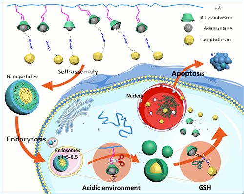 中科院成都生物所李帮经研究员课题组长期致力于基于环糊精主客体识别作用来构筑智能纳米递药系统。针对肿瘤细胞内存在的高浓度谷胱甘肽(GSH)及酸性环境特性,该课题组利用环糊精修饰的天然多糖透明质酸和金刚烷修饰的抗癌药物喜树碱(ADA-CPT),通过环糊精与金刚烷的特异性主客体识别作用,简单高效地构筑了一类双重肿瘤微环境刺激响应性的纳米递药体系。当纳米药物载体通过肿瘤组织的EPR作用富集在肿瘤组织中,并进一步被肿瘤细胞内吞后,肿瘤细胞内的酸性环境将环糊精与透明质酸相连的pH敏感的亚胺键破坏,释放出环糊精与金刚烷的包合物(β-CD/ ADA-CPT),并形成粒径更小的载药纳米体;同时,在高浓度的GSH环境存在下,ADA-CPT分子中的双硫键结构破坏,并进一步释放出抗癌药物CPT,实现对肿瘤细胞的杀灭作用,如图1所示。通过利用肿瘤细胞内的酸性环境及高浓度GSH环境,该双重刺激响应性的纳米递药体系还可以实现抗癌药物的分步按需释放,提供更为灵巧的控制释放性能。