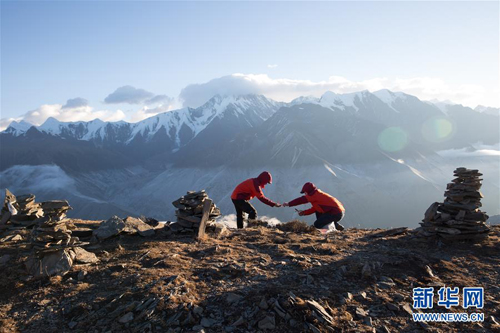 科研人员刘巧(左)、冉飞在贡嘎山西坡采集植物样本(11月23日摄)。新华社记者 金立旺 摄