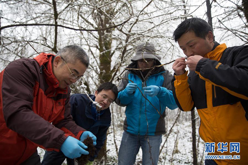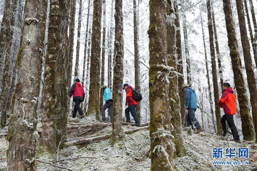 科研人员吴艳宏、孙宏洋、邴海健、罗辑(从左至右)在林间采集样本(11月21日摄)。新华社记者 金立旺 摄