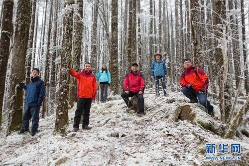 部分科研人员在林间合影,从左至右为:孙宏洋、刘巧、杨燕、王根绪、胡增元、冉飞(11月21日摄)。新华社记者 金立旺 摄