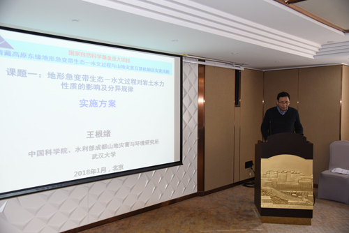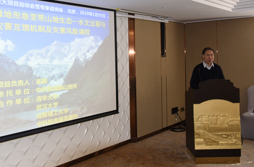 1月30日,由成都山地所主持,清华大学、武汉大学、成都理工大学、中科院青藏高原所共同承担的国家自然科学基金重大项目“青藏高原东缘地形急变带山地生态-水文过程与山地灾害互馈机制及灾害风险调控”项目启动与专家咨询会在北京召开。专家组由孙鸿烈院士、郑度院士、刘昌明院士、陈运泰院士、夏军院士、黄润秋教授、石根华教授、姚仰平教授和彭建兵教授组成。国家自然科学基金委副主任刘丛强院士、地学部姚玉鹏处长、刘羽处长、张朝林处长,中科院前沿科学与教育局副局长王颖教授、地球科学处段晓男处长及成都山地所副所长陈晓清研究员、科技处副处长葛永刚研究员出席会议。会议由专家组组长孙鸿烈院士主持。