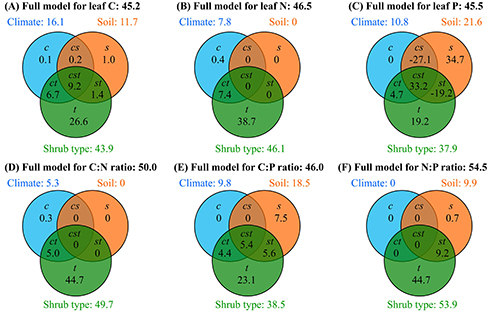 气候、土壤和灌丛类型对叶片碳氮磷化学计量学影响的一般线性模型分析