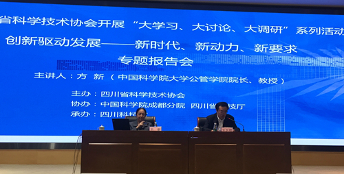 “创新是引领发展的第一动力。”为响应国家创新驱动发展战略和四川省委开展“大学习、大讨论、大调研”活动的号召,4月16日,四川省科协、成都分院、四川省科技厅共同举办的“创新驱动发展——新时代、新动力、新要求”专题报告会在四川科技馆举行。四川省科协党组书记、副主席王万锟,成都分院副院长陈锋,国科大公共管理学院副院长王海燕等出席报告会。会议由王万锟主持。