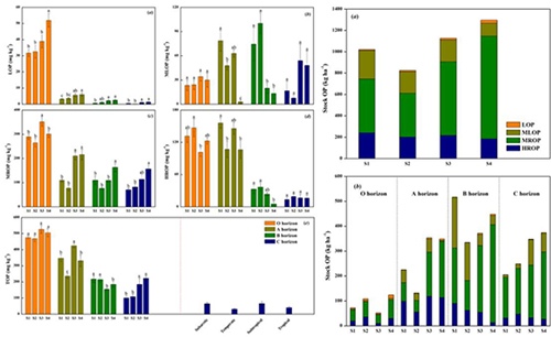 研究发现,随海拔升高,活性有机磷(LOP)、中稳性有机磷(MROP)和总有机磷(TOP)浓度有增大趋势,而高稳性有机磷(HROP)则相反。A层和B层土壤中活性有机磷(MLOP)浓度有减小趋势,但其在O层和C层土壤中浓度均不存在显著性差异(P < 0.05)。TOP和MROP储量随海拔升高而增大,但两者的最小储量均在2781 m样点。LOP储量随海拔升高逐渐增大,4个采样点的MLOP和HROP储量均不存在显著性差异(P < 0.05)。