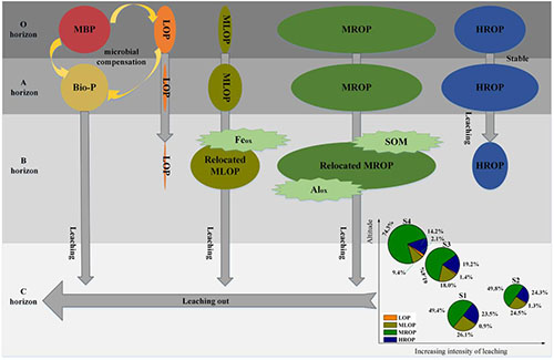 土壤TOP随海拔升高而增大的分布模式主要由于随海拔升高温度降低,微生物活性减弱导致有机磷矿化减慢。此外,淋溶过程也对其赋存特征产生明显干扰,导致其最小储量在2781 m样点。为补偿淋溶造成的土壤生物有效磷(Bio-P)流失,生态系统不仅直接利用微生物量磷(MBP)补偿,且通过促进磷酸酶活性矿化LOP提高Bio-P供给。 MLOP和MROP是随淋溶迁移最主要的两种有机磷形态,两者的垂向迁移主要依赖于土壤有机质(SOM)、无定形铁(Feox)和铝(Alox)。淋溶迁移过程中大部分有机磷在B层累积,但仍有少量有机磷流失。HROP是最稳定的有机磷形态,其海拔分布特征受淋溶作用的影响较小。