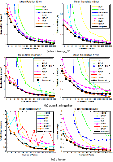 图1  不同配置的平均旋转和位移误差的比较:(a)普通三维情况;(b)准奇异情况;(c)平面情况