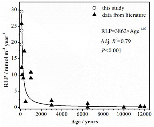 研究发现,早期成土阶段(0–120年),P风化速率随成土年龄快速升高,风化速率的变化可用幂函数拟合(图1)。在成土年龄小于60年的阶段,P风化速率从2.6 mmol m-2 year-1增至8.7 mmol m-2 year-1,在成土年龄60–120年以针叶林为主的阶段,P的平均风化速率增至26.0 mmol m-2 year-1。针叶林阶段P的风化速率大于温带和亚热带年龄相近土壤的P风化速率,主要是由于贡嘎山土壤母质具有较多的含P矿物、适宜的水热条件和快速发育的植被。成土年龄在百年至万年的阶段,P风化速率呈幂函数快速降低,可分为三个阶段:小于260年,P风化速率大于10 mmol m-2 year-1;260–2200年,P风化速率介于1–10 mmol m-2 year-1之间;大于2200年,P风化速率降至1 mmol m-2 year-1以下(图2)。贡嘎山冰川退缩区原生矿物P平均风化速率是全球风化“热点区”的7倍,全球P释放速率的47倍,表明气候变暖已间接加速了高山地区的生物地球化学循环。