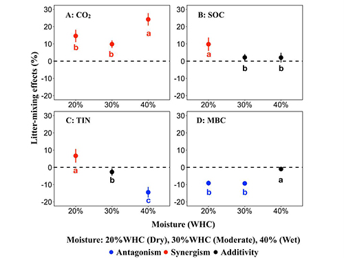 研究认为,混合凋落物对土壤生物地球化学循环过程的影响会受到环境因子的调节,土壤水分条件是影响混合凋落物对土壤碳氮过程非加和效应的因子之一。具体表现在:水分含量的增加会放大混合凋落物对CO2排放的协同效应或者减弱对MBC的拮抗效应,但是会增强对可溶性有机碳以及可溶性有机氮的拮抗效应。
